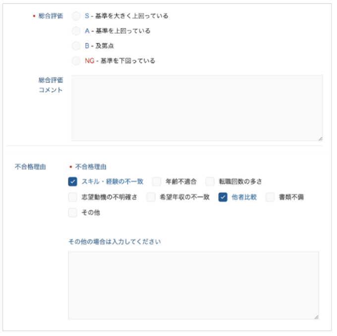 固定項目である「総合評価(S/A/B/NG)」と「総合評価コメント」に加えて、自社独自の評価項目をカスタマイズして追加することができます。
