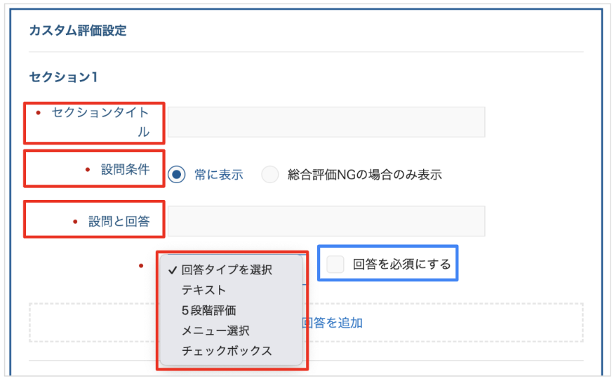 「セクションタイトル」「設問」「回答タイプ」「設問条件」「回答の必須・任意」の5箇所を設定できます。