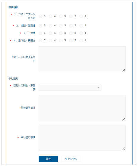 書類選考や面接などの各選考ステップでの評価や、応募者からのヒアリング結果を入力できるフォームです。