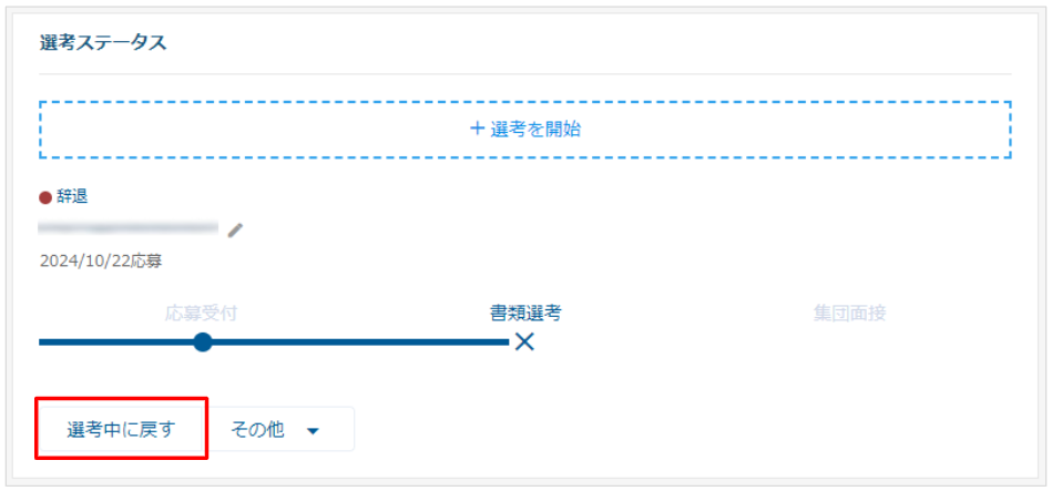 ※「選考中に戻す」をクリックすると「辞退日」「辞退理由分類」「辞退理由」が削除され、辞退処理前の状態に戻ります。
