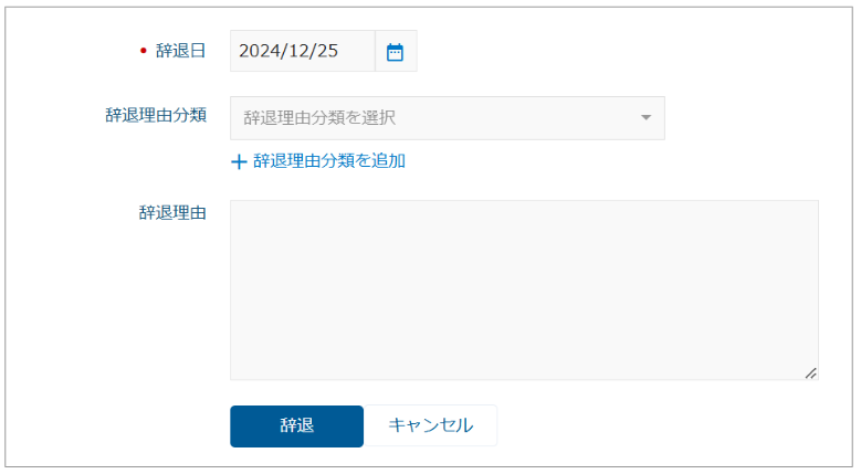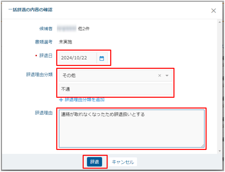 4. 「辞退理由分類」「辞退理由」を任意で入力します。