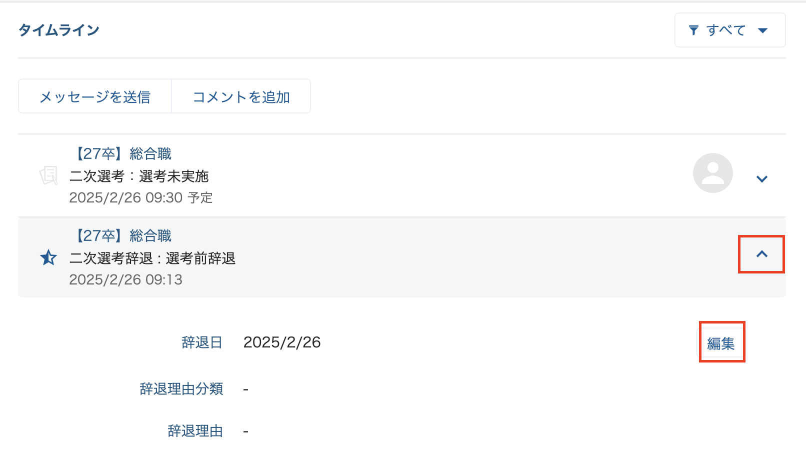 「タイムライン」にて変更したい辞退処理の「∨」マークをクリックし、「編集」をクリックすると「辞退日」「辞退理由」を変更することができます。