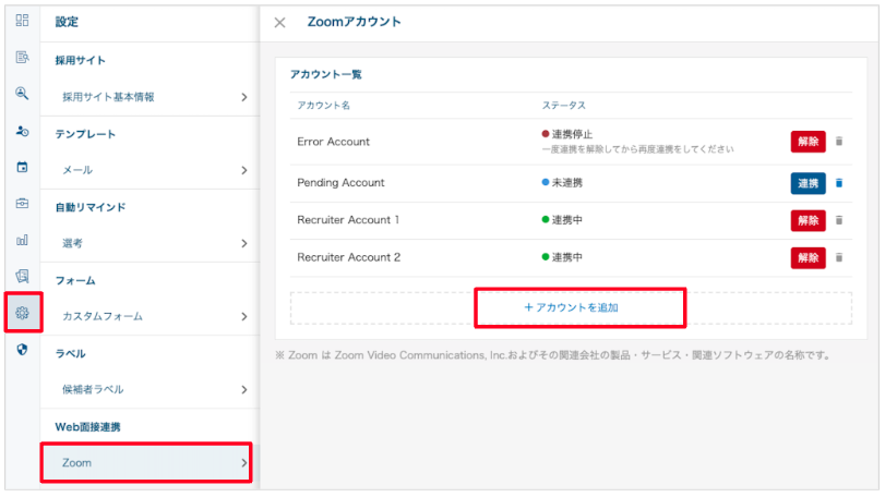 5. 追加したアカウントの「連携」ボタンをクリックし、連携するZoomアカウントの情報を入力します。「ステータス」が「連携中」に切り替わったら設定完了です。