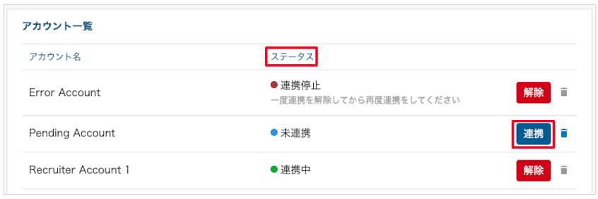 ※「ステータス」が「連携停止」となっているアカウントは、Web会議URLの作成ができない状態です。「解除」をクリックし、再度「連携」をクリックしてください。