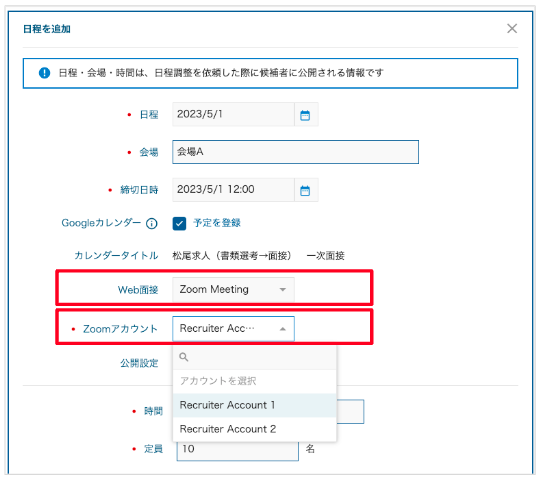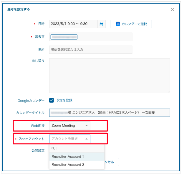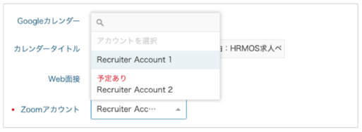 1. 選考・面談の設定時に「Web面接」で「Zoom Meeting」を選択すると「Zoomアカウント」を選択する項目が表示されます。