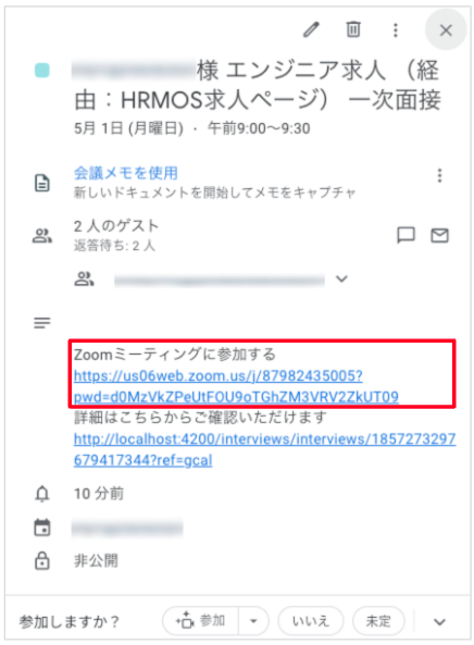 発行されたWeb会議URLは、Googleカレンダー・Outlookカレンダーの説明欄にて確認できます。また、候補者のタイムラインにおいて、Web会議URLを確認できます。