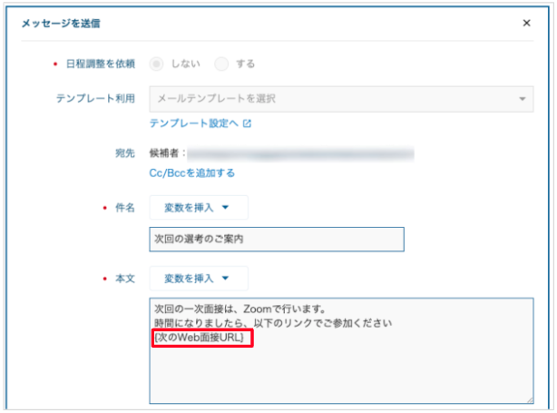 候補者やエージェントへのメール送信時に、Web会議URLを変数として利用できます。