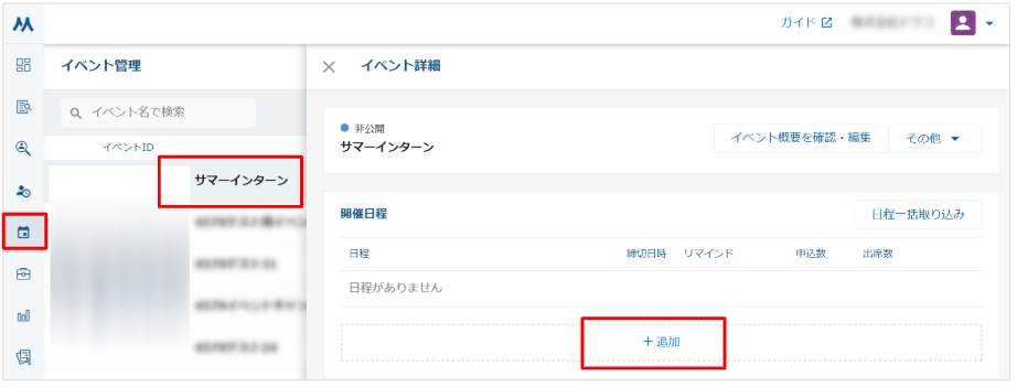 1. 「イベント管理」画面よりイベントを選択し、「追加」をクリックします。