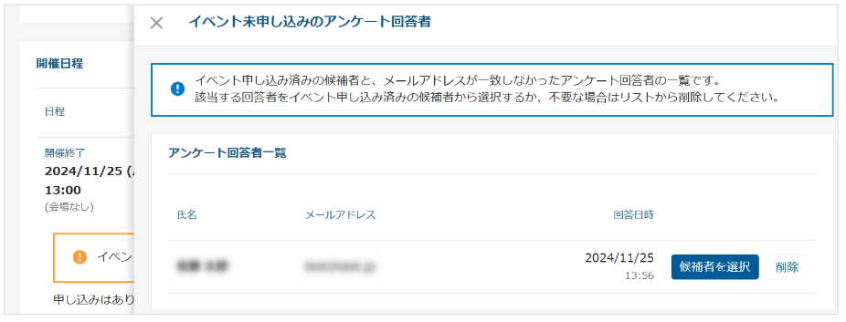 該当する申込者を選択しアンケートの回答結果と紐付けを行うか、不要な回答データの場合は削除をお願いいたします。