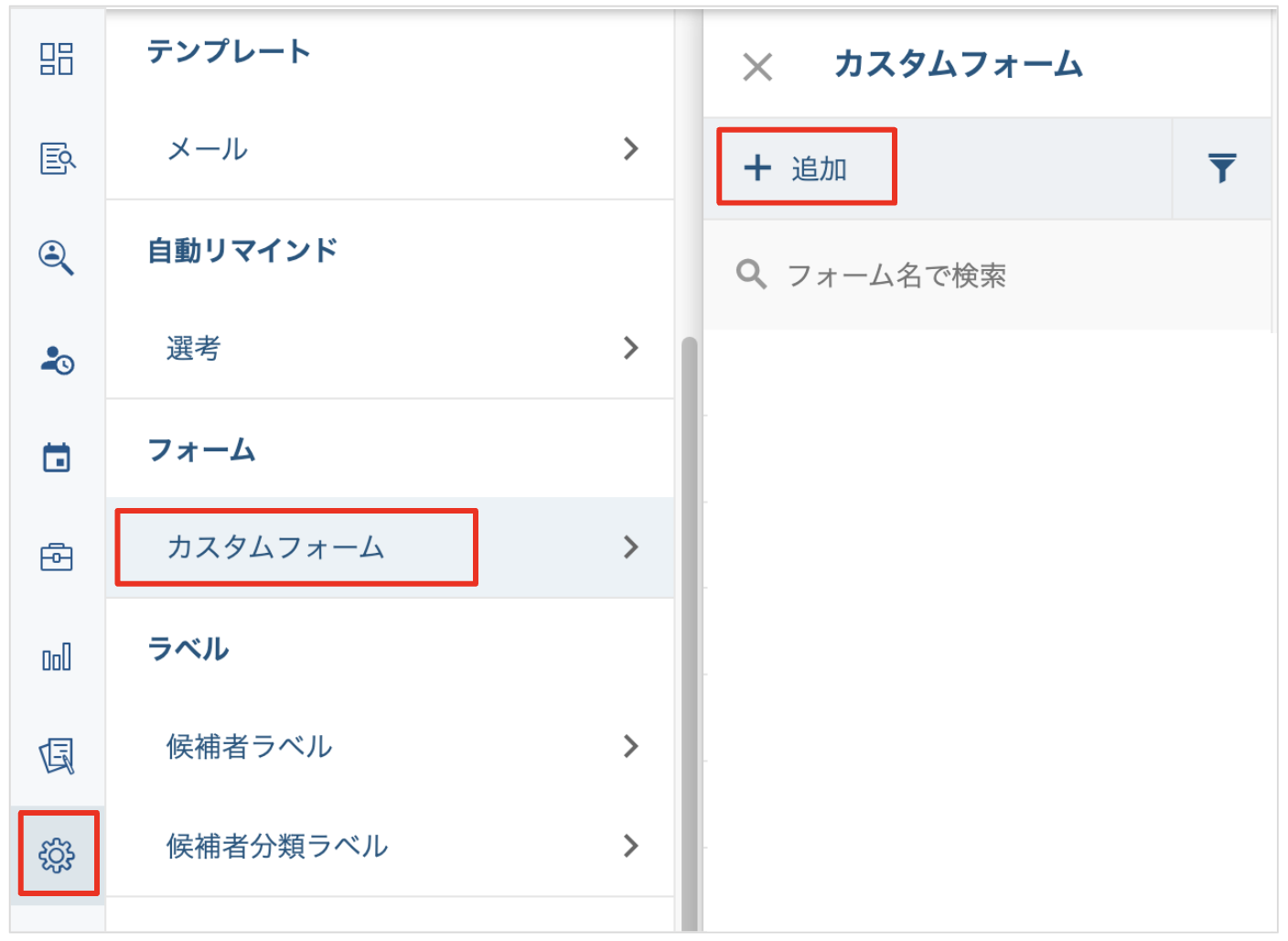 1. 左メニュー「設定」>「カスタムフォーム」>「+追加」をクリックします。