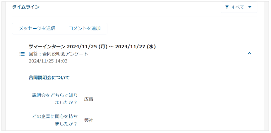 また、その候補者の回答として候補者ページに回答内容が登録され、タイムラインで閲覧できます。