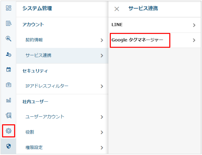 1. 左メニュー「システム管理」内 「サービス連携」 をクリックして「Googleタグマネージャー」をクリックします。
