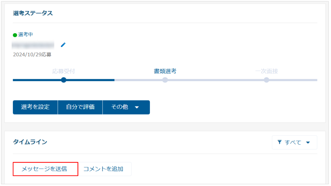 各候補者の詳細画面にある「タイムライン」にて確認できます。更新履歴が多い場合は「メッセージ」で絞り込むことで見つけやすくなります。