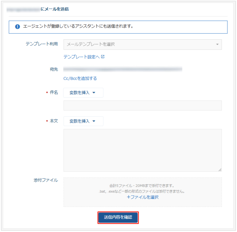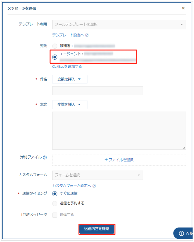 3. 「宛先」で「エージェント」を選択して、メールを作成後「送信内容を確認」をクリックします。