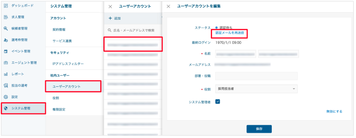 「システム管理」→「ユーザーアカウント」より登録したメールアドレスをご確認お願いいたします。