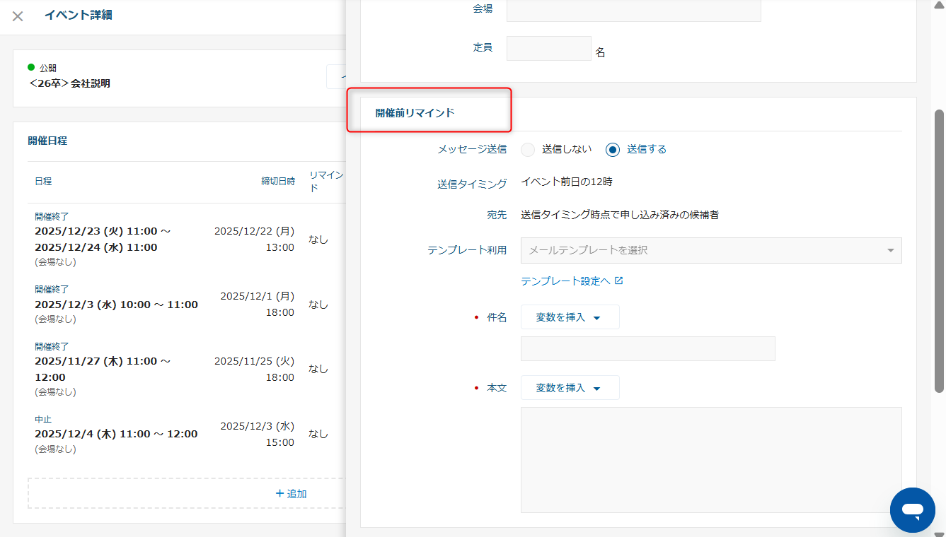 設定画面から送信するイベント案内のリマインドにつきましては、イベント案内を送信した同じ宛先に送信されます。