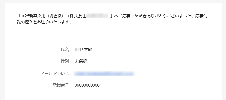 応募フォームからエントリーした学生に対して、入力情報の控えは自動送信されていますか? 2025年03月10日 07:26 更新 Q.応募フォームからエントリーした学生に対して、入力情報の控えは自動送信されていますか?A.はい。メールにて入力内容の控えを送付しております。ただ、「添付ファイル」の項目については、メール上では確認することができかねます。 関連記事 候補者やエージェントへ履歴書等の書類提出依頼やアンケートの回収をする(「カスタムフォーム」の活用) イベントに申し込んだ際に、サンクスメールを自動で送りたい 面接官向けガイド 自動メール・リマインドメールの設定方法を一覧で知りたい 選考枠を予約した際に候補者に送られる自動送信メールを停止したい