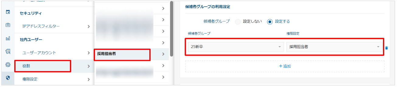 2. 「システム管理」→「役割」より、該当の役割に「候補者グループの利用設定」が設定されているかご確認ください。