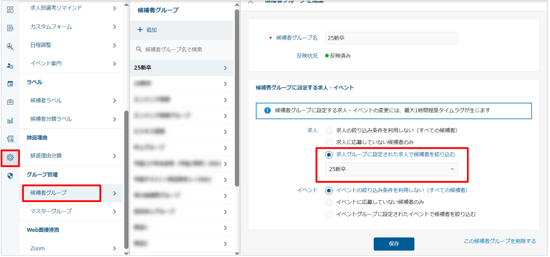 こちらの画面で「求人グループに設定された求人で候補者を絞り込む」にチェックが入っている場合、
