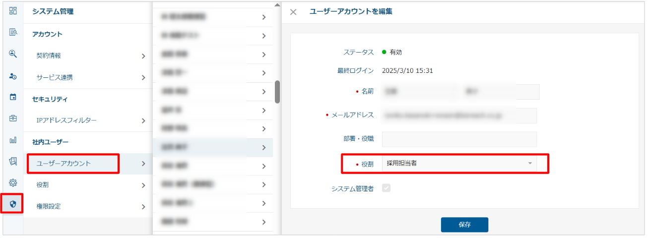 1.「システム管理」→「ユーザーアカウント」よりご自身に紐づいている「役割」をご確認ください。