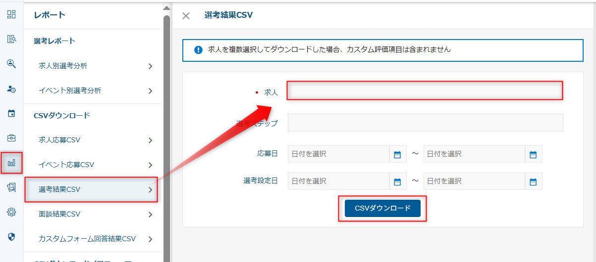 1.「レポート」>「選考結果CSV」をクリックし、求人を選択してダウンロードする