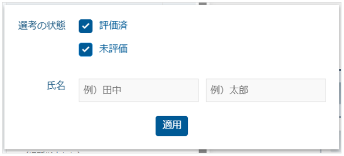 ・デフォルトは「評価済」のチェックが外れた状態になっています。評価済みの応募者情報を閲覧したい場合は、「評価済」のチェックを入れてください。