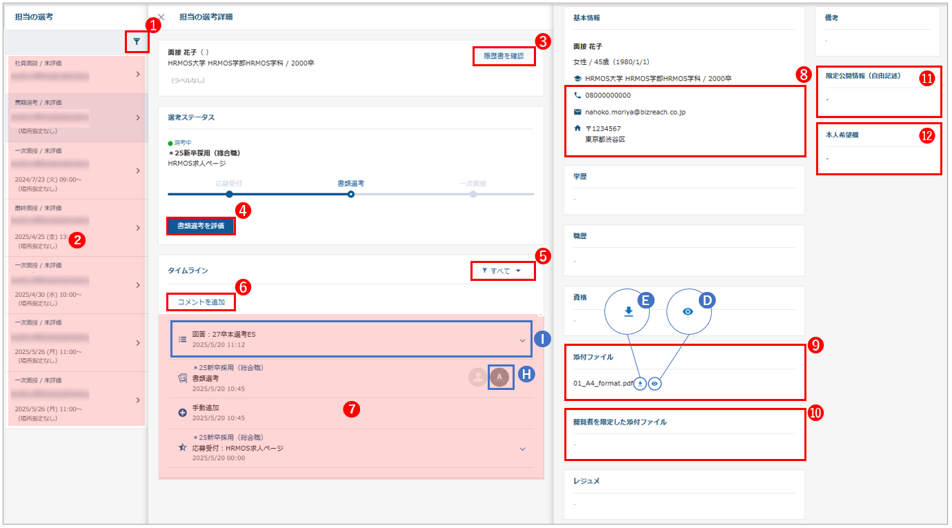 | 7 | タイムライン/面接・評価 | 選考や面談の設定状況や評価状況が表示されています。 なお、メール履歴は一切閲覧することはできません。 |