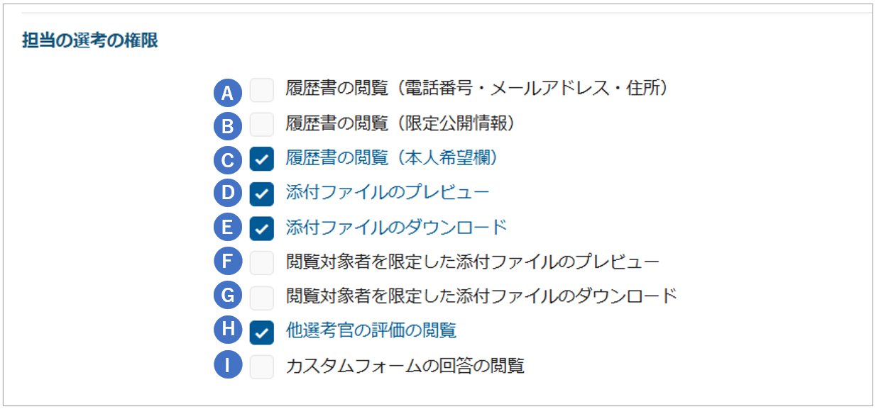 ※チェックが入っているものがデフォルトの面接官に付与されている権限です