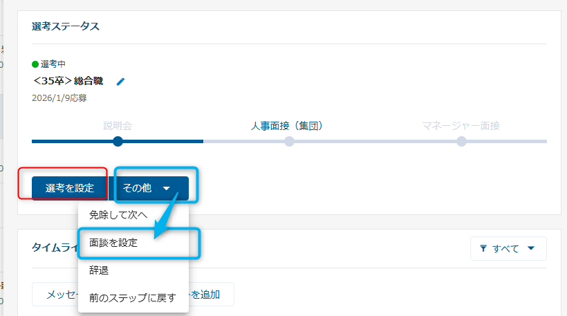 以下の画像のように、カスタム評価を設定した選考ステップか、また、画像赤枠「選考を設定」から設定した選考ではなく青枠の「面談」ではないかご確認いただきますようお願いいたします。