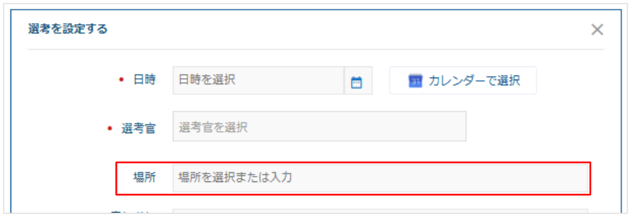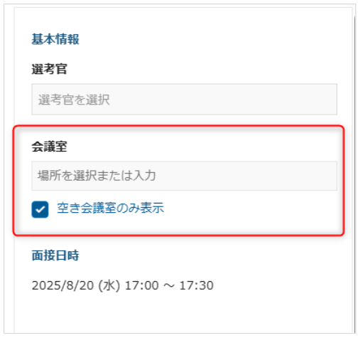 選考設定時に選択肢として表示される会議室は空き会議室のみでしょうか? 2025年09月08日 07:22 更新 最終更新:2025/09/02Q. 選考設定時に選択肢として表示される会議室は空き会議室のみでしょうか?A. 以下の選択肢には空き状況に関わらずすべての会議室が表示されます。空き状況も確認したい場合、「カレンダーで選択」から以下の「空き会議室のみ表示」にチェックを入れてください。