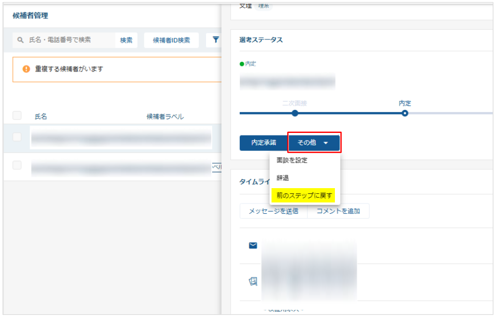 候補者詳細ページの「その他」をクリックし「前のステップに戻す」をクリックするとステータスが【選考中】に戻ります。