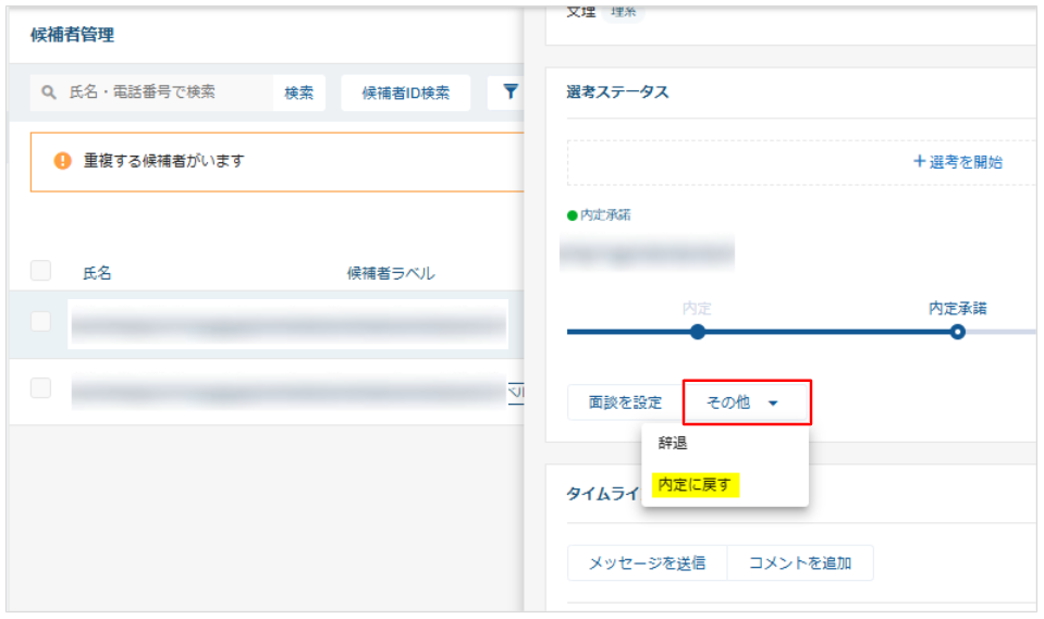 候補者詳細ページの「その他」をクリックし「内定に戻す」をクリックします。