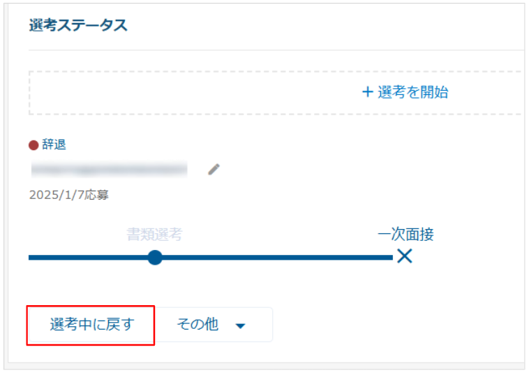候補者詳細ページの選考ステータス欄にある「選考中に戻す」をクリックするとステータスが【選考中】に戻ります。