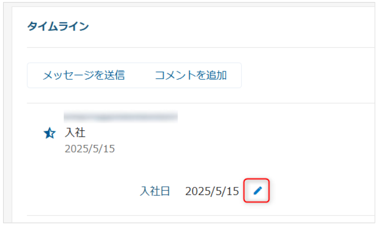 1.候補者詳細ページのタイムライン内「入社」に表示されている【入社日】を鉛筆マークから未来の日付に変更します。