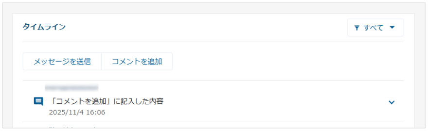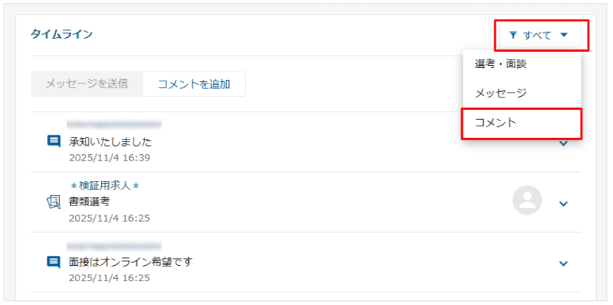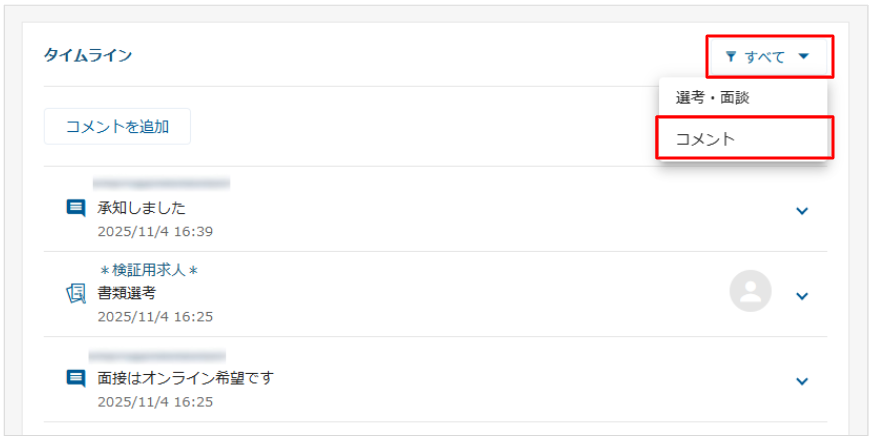 2. 「タイムライン」右の「すべて▼」から「コメント」を選択すると、コメントのみが絞り込まれた状態になります。