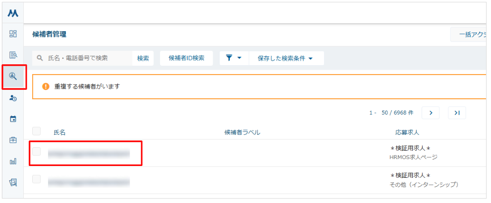 1. 左メニュー「候補者管理」をクリックして、該当の候補者を選択します。