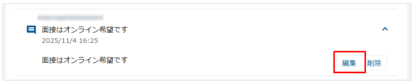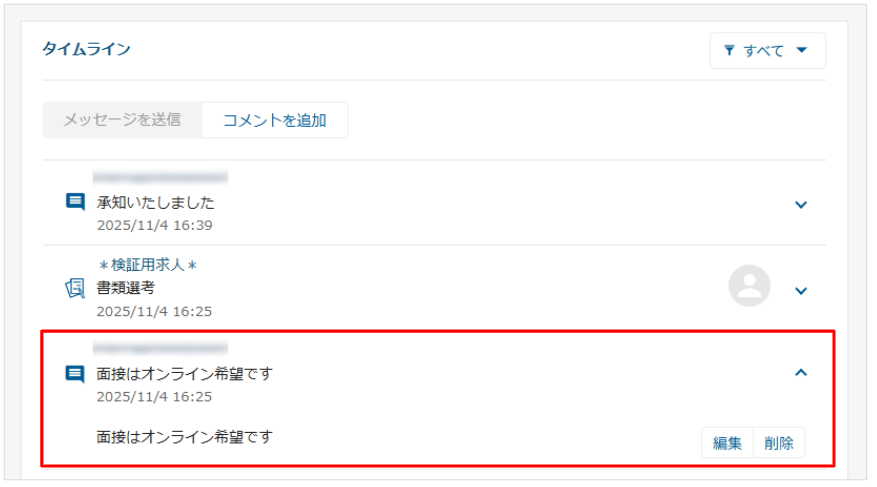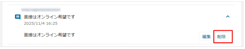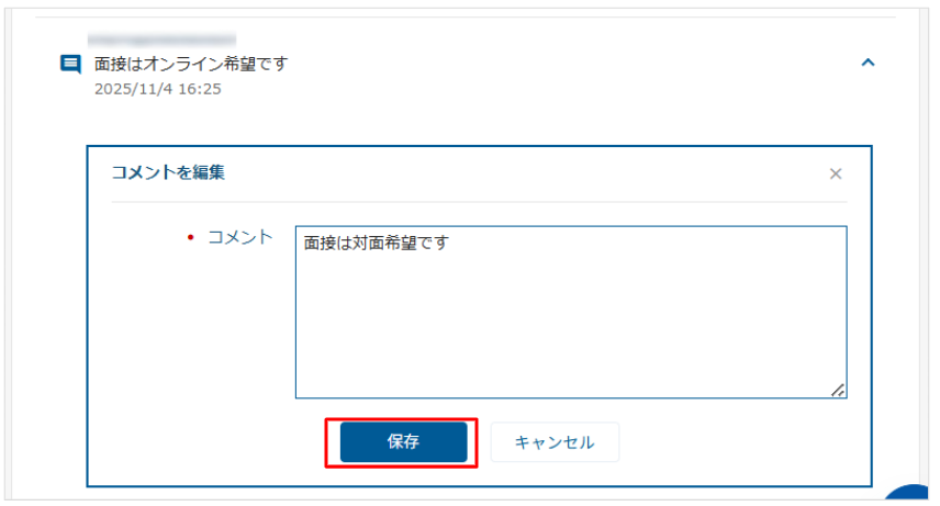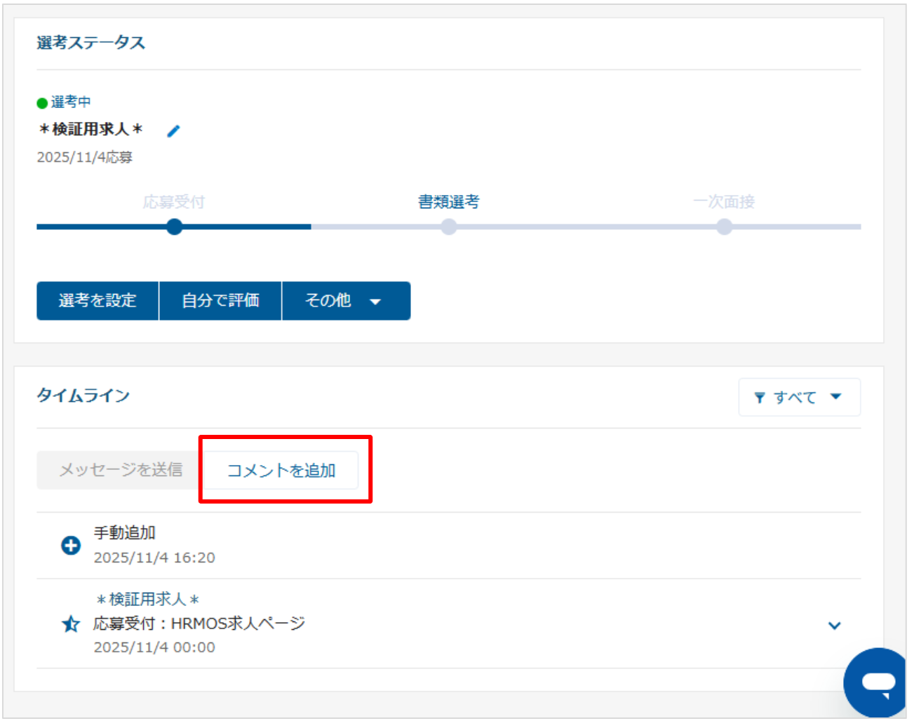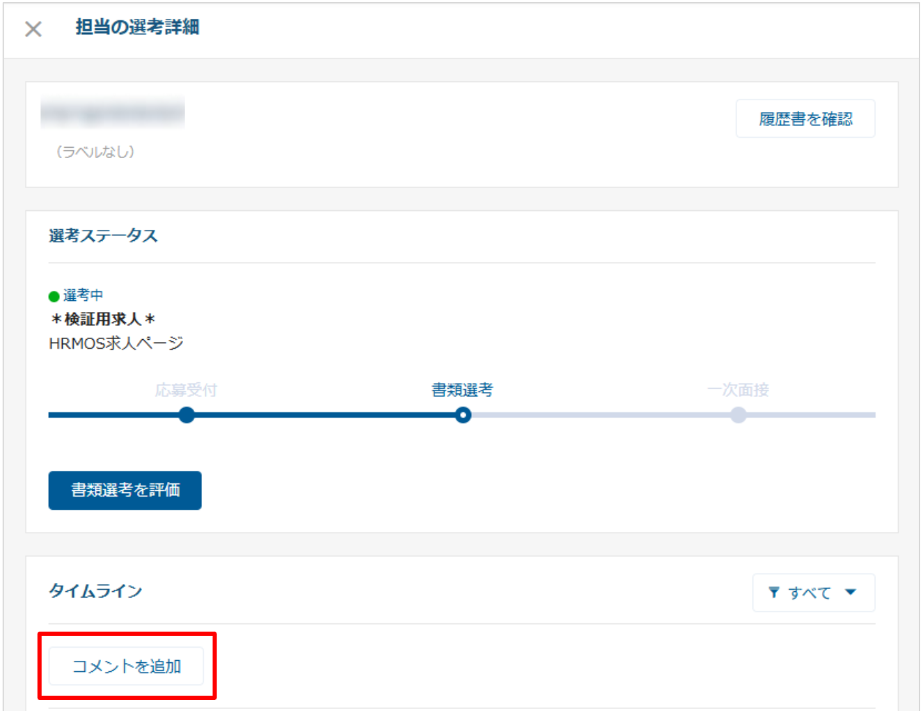 社内の申し送り項目や、応募者に対するメモを「コメント」として残すことができます。