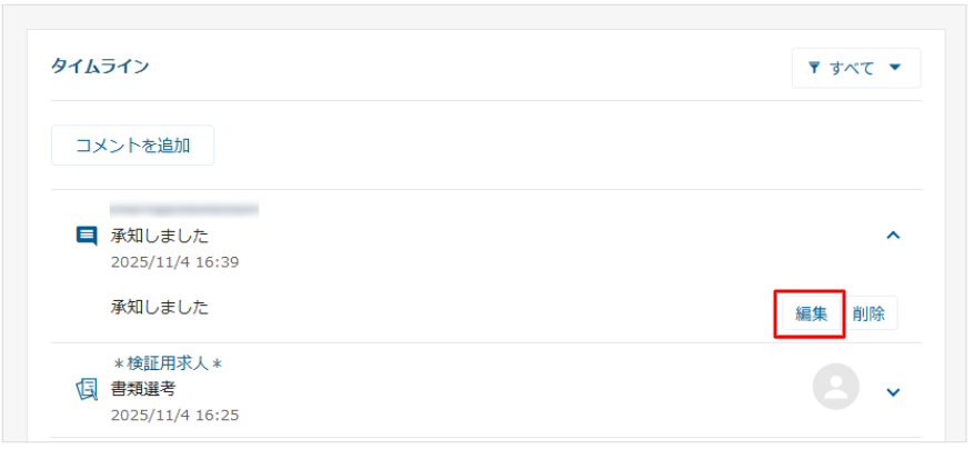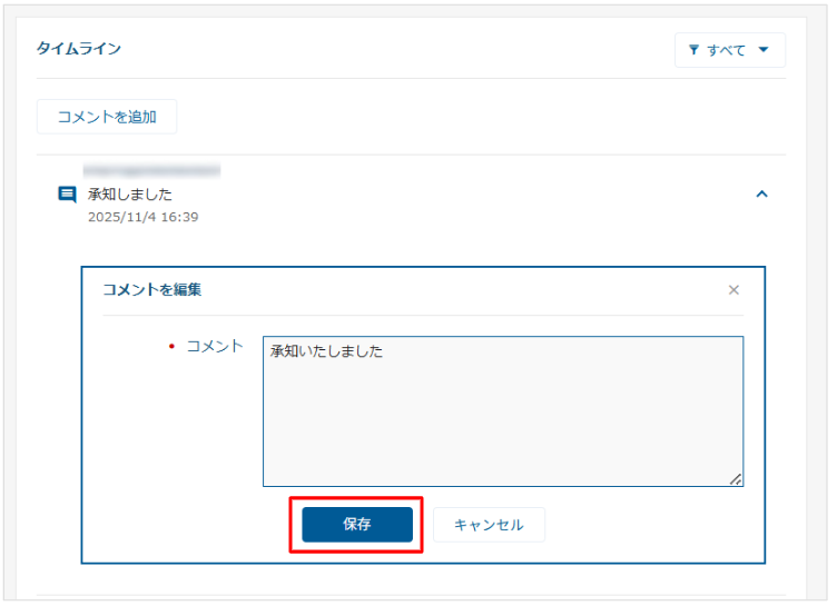 2. 「タイムライン」内の変更・削除したいコメントをクリックします。