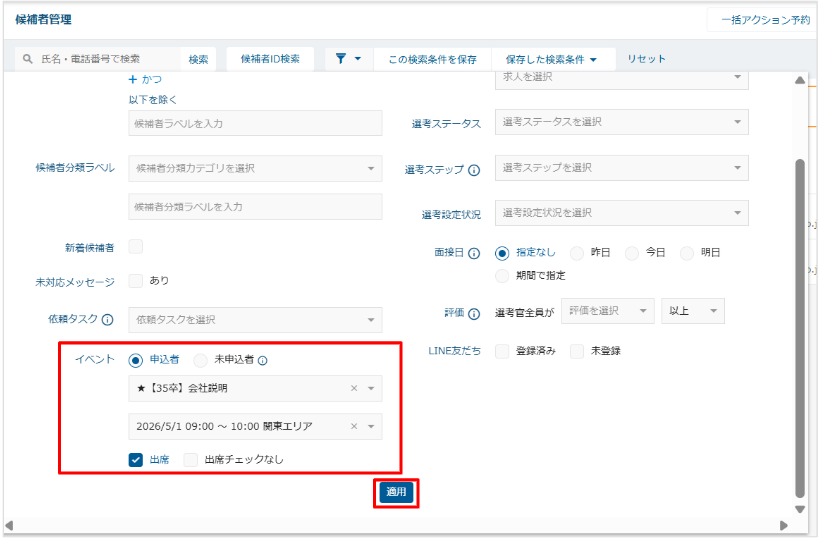 2. 「イベント」にて検索したい条件(「申込者」やイベント名・イベント日時、出席有無)にチェックを入れ「適用」をクリックする