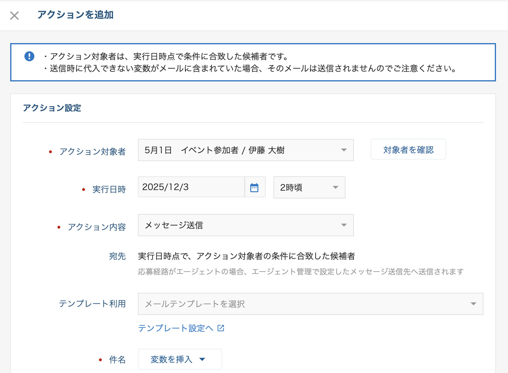 7.「アクション対象者」で先ほど作成した検索条件を選択。「実行日時」「アクション内容」を設定する