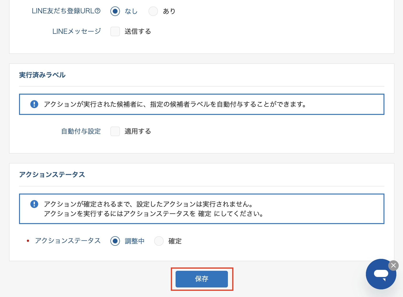 8.送信する文面や、「実行済みラベル」「アクションステータス」の設定をし、「保存する」
