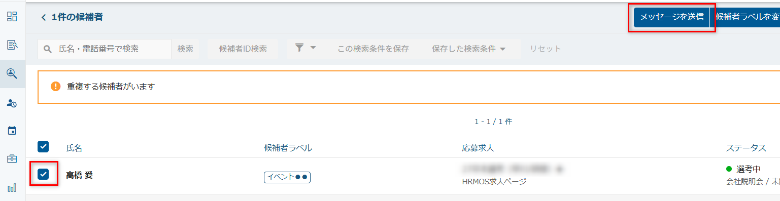 3. 表示された候補者を選択し、「メッセージを送信」をクリックしメールを送信する