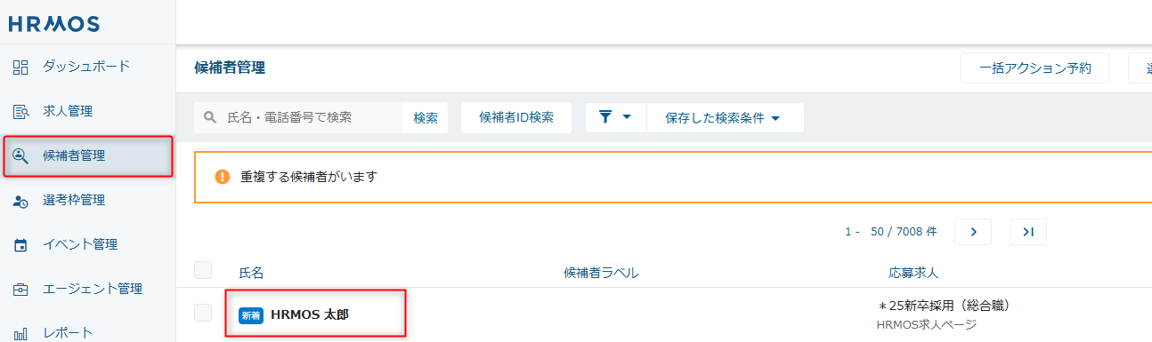 1. 左メニュー「候補者管理」をクリックし、選考対象の候補者をクリックします。