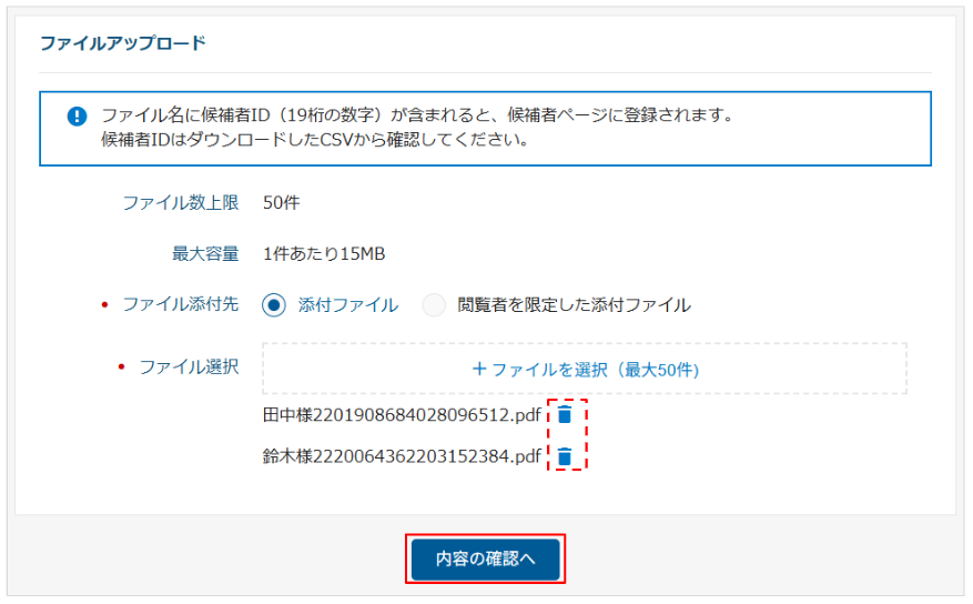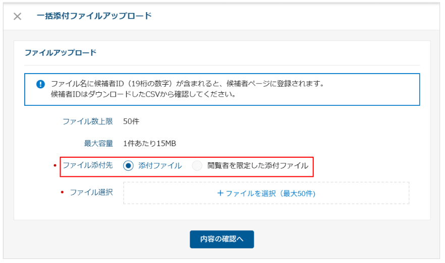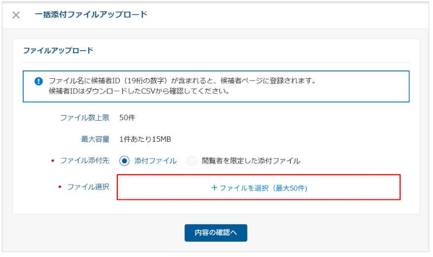 最大50ファイルを候補者に紐づけて一括でアップロードできます。