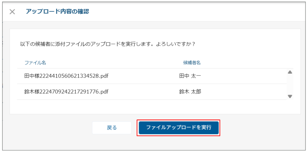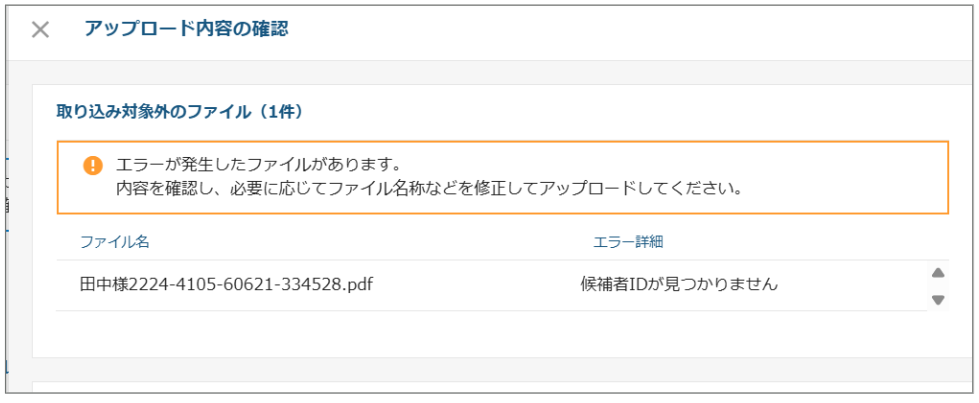 ファイル名に候補者IDが正しく入力できていないと「候補者IDが見つかりません」というエラーが表示されます。