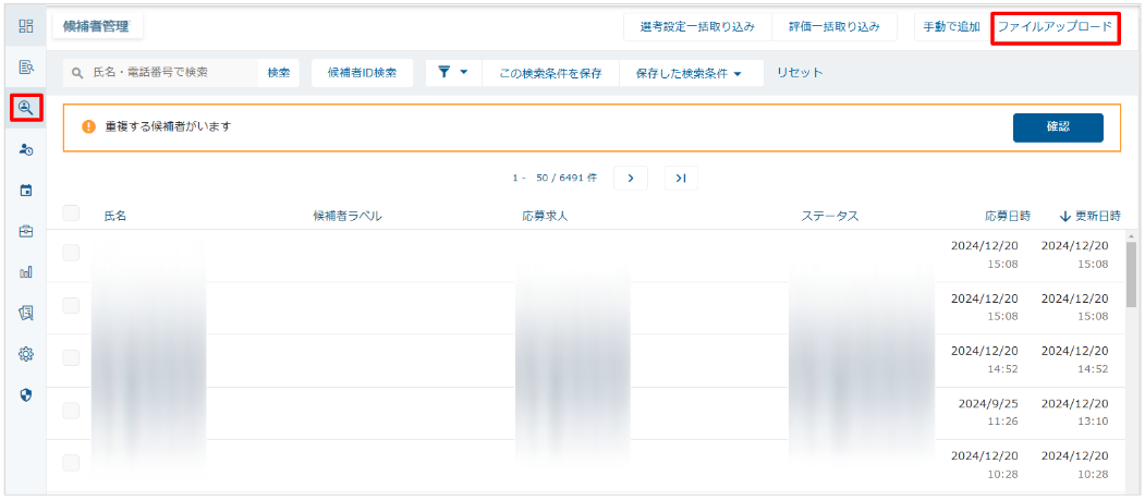 1. 左メニュー「候補者管理」をクリックし、「ファイルアップロード」をクリックします。